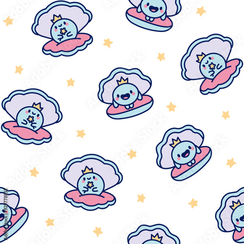Cartoon kawaii seashell with a pearl. Seamless pattern. Funny aquatic life. Hand drawn style. Vector drawing. Design ornaments.
