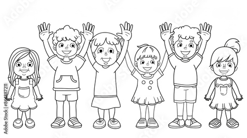 Cartoon kids raising their hands, outlined for coloring, on a white background.