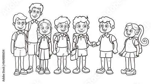 cartoon, children, with, school, coach, outlined, colouring, white, background, illustration, book, vector, page, children, cute, colouring, drawing, comic, graphic, outline, black, character, nature, summer, tree, art, fun, animal, line, doodle, education, preschool, smile, wildlife, funny, vignetting, baby, isolated, adult, design, hand, sky