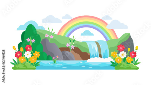 Cartoon landscape featuring a waterfall and rainbow isolated on white background, surrounded by colorful flowers and lush greenery in a serene natural setting