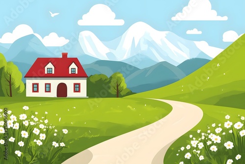 house, mountain, landscape, cartoon, illustration, sky, grass, field, path, road, green, white, red, blue, nature, tree, cloud, flower, spring, summer