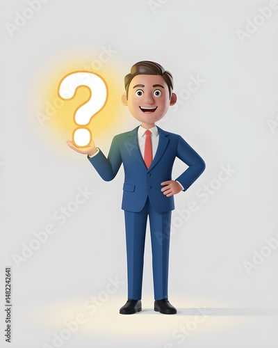 Cartoon man in a suit holding a question mark with a bright glow on a plain white background studio shot