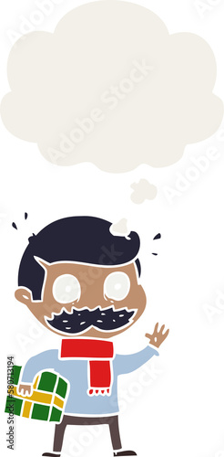 cartoon man with mustache and christmas present and thought bubble in retro style