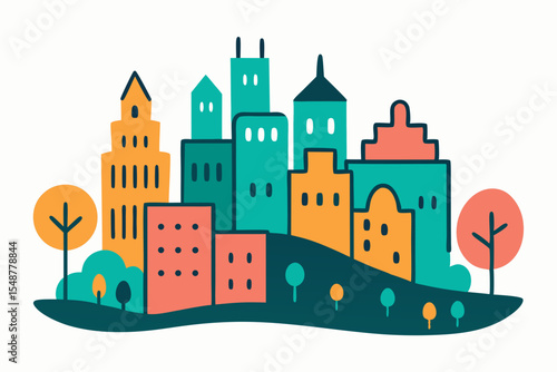 Cartoon medieval castle illustration with towers and flags, a fairytale fortress in a city or on a hill