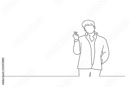 Cartoon of handsome young businessman showing mini heart or heart shaped hands gesture. Line art style