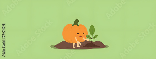 pumpkin, character, planting, seed, dirtied, green, cartoon, garden, growth, agriculture, nature, cute, playful, environment, vegetable, animation, happy, spring, nurturing, fun, creativity, colourful, illustration, harvest, childlike, whimsical, plant, cartoonish, foliage, cheerful, small, joyful, earth, ecology, sustainable, farming, playfulness, joy, life