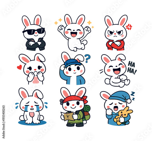 Cartoon rabbit characters displaying a wide range of emotions and actions, including happy, angry, confused, crying, loving, laughing, adventuring, sleeping, and cool