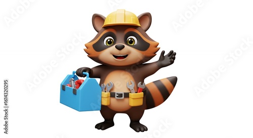 raccoon, cartoon, animal, character, construction, helmet, toolbox, tool, friendly, cute, brown, orange, yellow, blue, adorable, graphic, illustration, three-dimensional, design, graphic design, children, education, work, isolated, white background, studio, copy space, design element, wildlife, mammal, animal