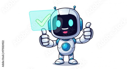 robot, cute, mascot, character, cartoon, vector, thumb up, ok, yes, approve, agree, success, good, positive, checkmark, icon, symbol, technology, ai, artificial intelligence, future, futuristic, happy, smiling, friendly, illustration, isolated, white background, automation, business, quality, assurance, certified, complete, done, task, result