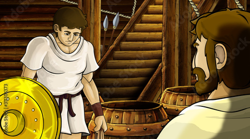 cartoon scene with roman or greek ancient character inside wooden ship chamber with golden shield illustration for children