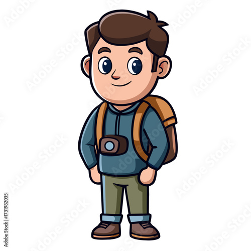 Cartoon Traveler with Backpack and Camera, Adventure and Exploration Character Illustration
