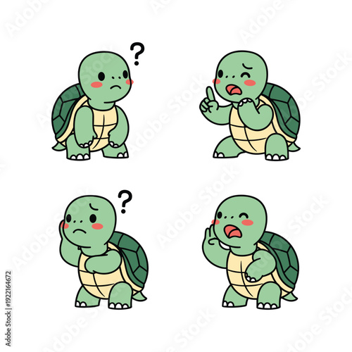turtle, cartoon, emotion, expression, character, green, animal, illustration, thought, bubble, question, confused, angry, surprised, funny, cute, simple, design, white, background, isolated, nobody, concept, feeling, reaction, comic, style, clip art, graphic, vector