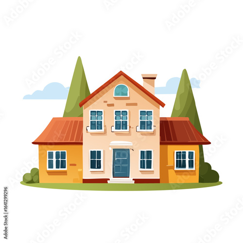 house, home, cartoon, dwelling, residence, building, two-story, red, blue, door, window, roof, chimney, tree, bush, lawn, grass, architecture, exterior, facades, illustration, design, property, real estate, mortgage, family, suburban, residential, estate, shelter, construction, structure, outdoors, countryside, rural, cloud, sky