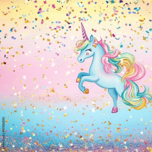 unicorn, confetti, pastel, gradient, background, cartoon, fantasy, fairy tale, magic, glistering, star, blue, pink, yellow, gold, mane, tail, horn, hoof, sparkle, celebration, party, design, illustration, art, drawing, animal, creature, mythical, magical, dream, decoration, festive, happy, joy, fun, whimsical, childish, cute, adorable, bright, colourful, vibrant, innocence, beauty, charme, elegance, grace, sweetness