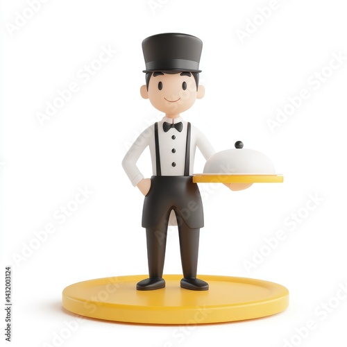 cute, three-dimensional, sticker, rendering, waiter, cartoon, character, illustration, food, service, hospitality, tray, dish, covered, eatery, catering, staff, smiling, happy, gentleman, formal, black, white, clothes, uniform, bow tie, tuxedo, standing, holding, presenting, person, figure, model, design, animation, image, graphic, entertainment, adorable, modern, contemporary, positive