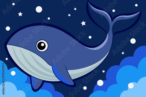 Cartoon whale swimming in the night sky with stars and clouds illustration art