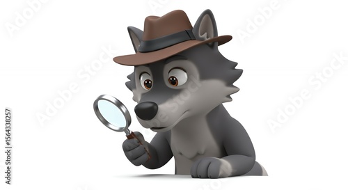 wolf, animal, cartoon, detective, magnifying, glasses, character, grey, brown, hat, isolated, illustration, graphic, digital, cute, design, pet, inquisitive, friendly, playful, image, graphic design, digital artwork, white, background, entertainment