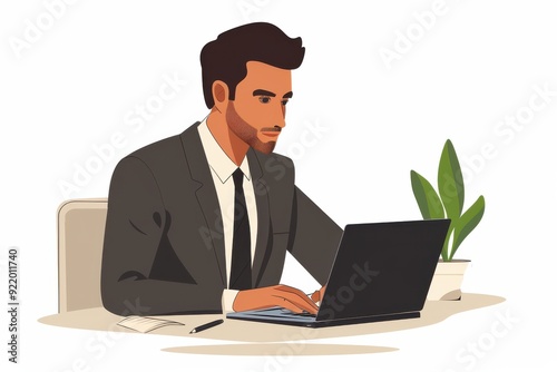 Cartoon-style businessman in a suit working on a laptop at his desk.
