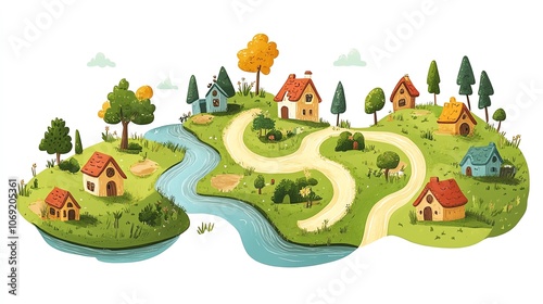 Cartoonstyle map with small houses, trees, and winding paths near a river, soft colors and whimsical design illustration isolated white background