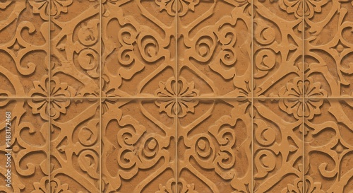 pattern, design, texture, tile, wood, carving, relief, ornate, intricate, symmetric, geometric, floral, arabesque, motif, repeat, brown, beige, embossed, background, surface, decor, craft, artwork, element, detail, style, ancient