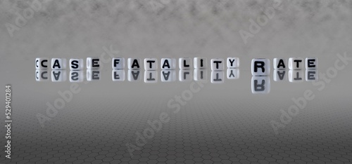 case fatality rate word or concept represented by black and white letter cubes on a grey horizon background stretching to infinity