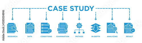 Case study banner web icon illustration concept with icon of research, data, conditions, examination, method, in-depth, analyzing, and result