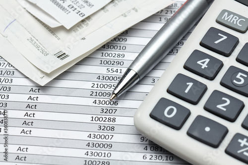 cash registers purchase receipt, calculator and financial reports, analysis and accounting, various office items for bookkeeping