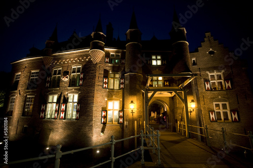 architecture, attraction, building, castle, colours, dark, dusk, dutch, exterior, flanders, fortified, fortress, historic, illuminated, lit, mediaeval, holland, night, old, tour tourism, travel, water