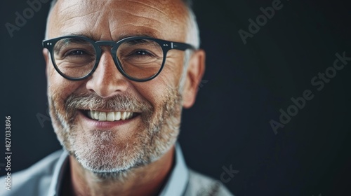 Casual businessman with glasses smiles confidently for a close-up portrait