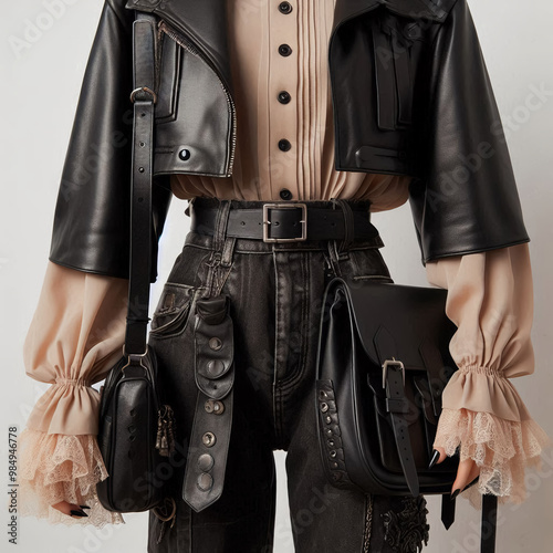 black, leather, jacket, belt, casual attire, outfit, fashion, edgy, trendy, stylish, outerwear, zip, biker, sleek, chic, cool, minimalistic, urban, modern, bold, statement, tough, rugged, fitted, polished, autumn, winter, clothes rack, classic, timeless, menswear, grunge, fashionable, accessory, buckle, minimalist, dark, contemporary, monochrome