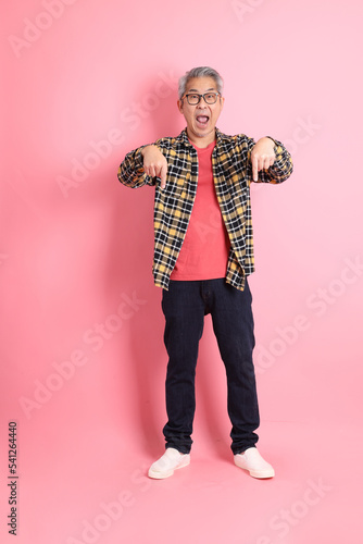 person, portrait, man, asian, 40s, male, isolated, adult, full, body, background, smart, length, studio, standing, casual attire, grey, japanese, chinese, colours, pink, fashion, plead, goggles, pointing, gesture, showing, finger, hand, down, direction, advertisement, presenting, copy space