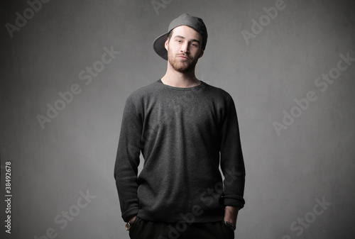 beauty, fashion, man, casual attire, sport, background, beard, beautiful, black, body, boy, caucasian, guy, photogenic, happy, hat, indoor, male, people, person, smile, studio shot, teenage, wall, young