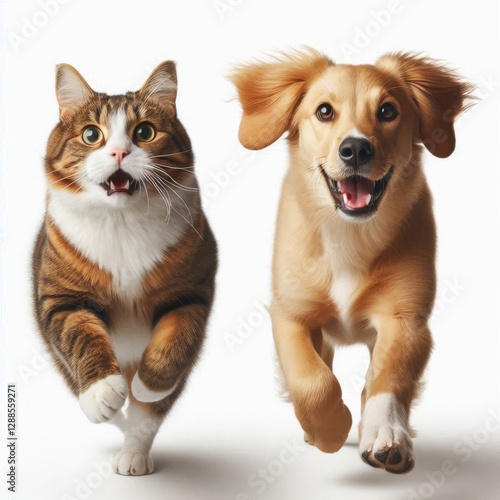cat and dog running side by side, both facing the viewer