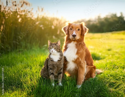 cat and dog sitting together in grass on sunny day freindship between tabby domestic cat and nova scotia duck tolling retriever
