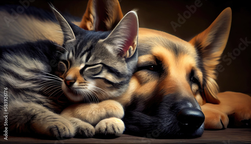 Cat and dog sleeping together. Kitten and puppy taking nap. Home pets. Love and friendship with Generative AI Technology