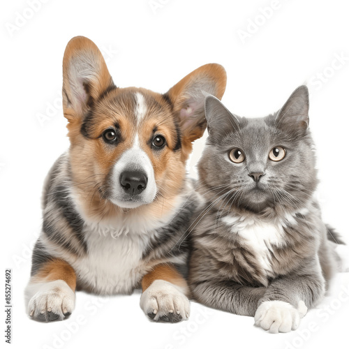 Cat and dog together panting Puppy Welsh Corgi looking at camera and proud grey cat Isolated on transparent background PNG