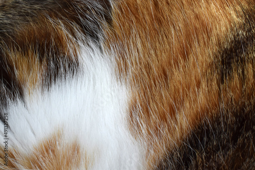 Cat fur texture background. Calico or tortoiseshell cat fur background. Pet hair or coat texture.