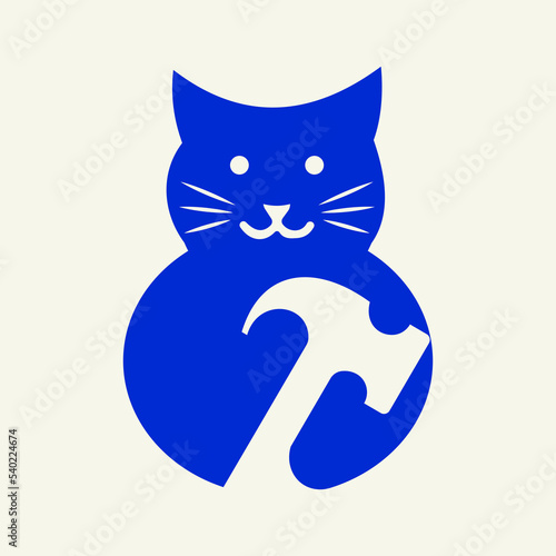 Cat Hammer Logo Negative Space Concept Vector Template. Cat Holding Hammer Symbol