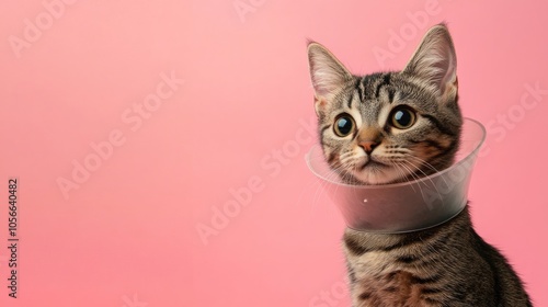 cat, cone, animal, space, text, banner, design, pet, veterinary, humorous, playful, cute, humor, health, recovery, pet, felino, comfort, quirky, headwear, portrait, attention, fun, cover, illustration, graphic, funny, image, earth, colours, cartoon, cheerful, blithe, surrounding, treatment, stylised, iconic, whimsical, feature, caption