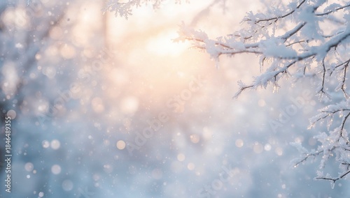 branch, twig, frost, icicle, snow, copy space, winter, timberland, backlight, bokeh, sunrise, serene, closeup, falling snow, snowflake, sunlight, pink, orange, blue, white, cool, contrast, soft, diffused, haze, calm, cold, frosty, icy, treeline, distant, blurred, foreground, background, scenic, landscape, snowfield, morning, golden hour, stillness, glistening