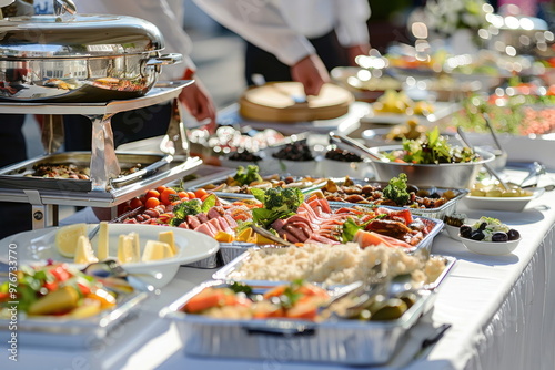 catering, food, eatery, table, event, party, celebration, banquet, luxury, dinner, plate, dining, meal, delicious, buffet, epicure, lunch, reception, wedding, eat, decoration, white, tasty, healthy, dish, snack, salad, service, arrangement