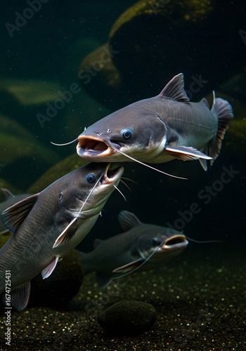 catfish, swim, underwater, aquatic, calm, dark, river, habitat, animal, fish, whisker, eye, gill, fin, mouth, water, rock, gravel, fresh water, wildlife, nature, view, scene, aquarium, observation