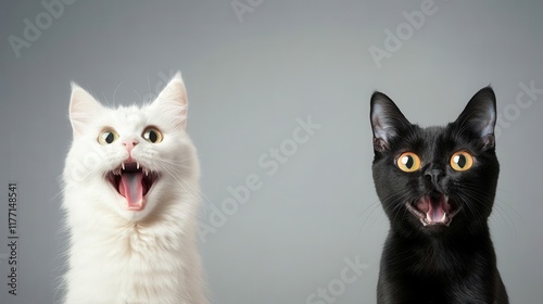 cat, surprise, curiosity, white, black, expression, emotion, pet, animal, felino, adorable, closeup, whisker, grey, background, portrait, fur, eye, funny, amusing, reaction, mouth, teeth, duet, pair, face, cute, mammal, domestic, joyful, playful, interaction, charming, personality, alert, whimsical, vibrant, lively, snapshot, mood, spontaneous, colourful, endearing