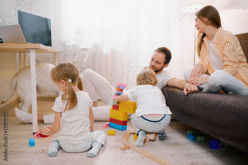 caucasian children, son and daughter playing on floor together while their parents relax or busy with their own affairs at home, happy family concept
