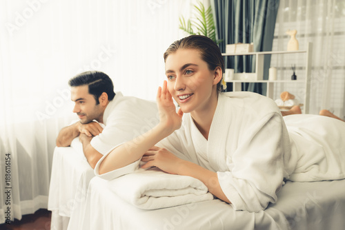 Caucasian couple customer enjoying relaxing anti-stress spa massage and pampering with beauty skin recreation leisure in day light ambient salon spa at luxury resort or hotel. Quiescent