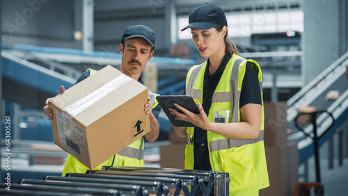 loader, receiving, inventory, tablet, sorting, teamwork, center, conveyer, conveyer belt, logistic, delivery, shipping, package, man, woman, caucasian, software, colleague, team, unloading, manager, men at work, warehouse, facility, cardboard box, automated, checking, automatic, technology, distribution, business, transportation, shipment, e-business, online, associate, supervisor, post office, manpower, commerce, shopping, discussion, productivity, optimize, advanced