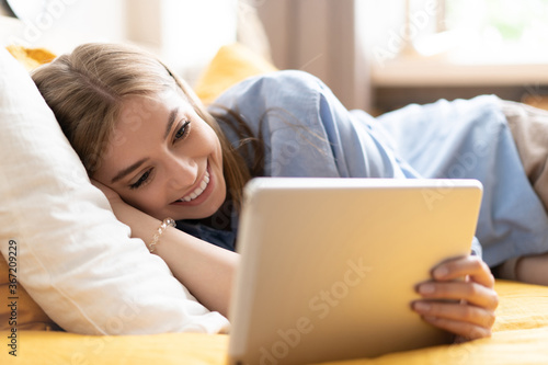 Caucasian girl having video chat with friends using tablet camera while lying on bed - technology, communication concept.