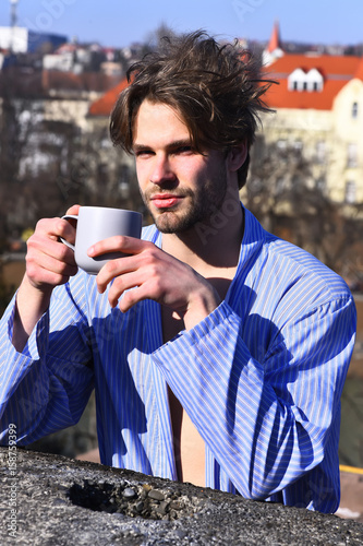 man, bearded, caucasian, pajama, cup, beard, unshaved, moustache, photogenic, barbershop, hairdresser, style, ruffled, background, hair, blue, striped, holding, roof, blurred, city, hold, morning, hot drink, tea, hot, young, modern, beauty, fashion, fashionable, guy, concept, amused, mug