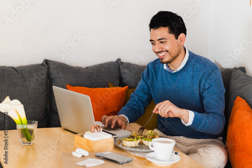 caucasian, man, eating, breakfast, home, using, laptop, entrepreneur, indoor, food, connection, professional, one person, individuality, cyberspace, contraption, co-worker, men at work, businessman, male, smartphone, phone, mobile, freelancer, business, technology, computer, communication, businessperson, table, sitting, person, hot drink, office, lunch, smiling, photogenic, work, dinner, horizontal, copy space