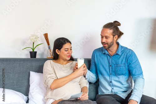Caucasian pregnancy woman drinking fresh milk during looking ultrasound photo of her newborn baby with husband on the bed in bedroom. Family relationship and pregnant maternity health care concept.